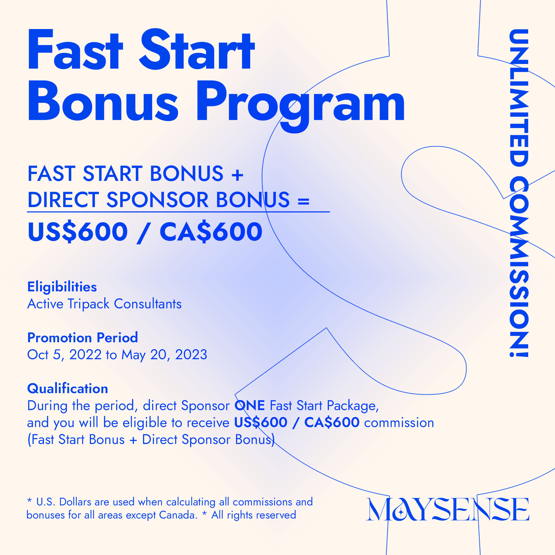 Qualifications: During the period, direct Sponsor ONE Fast Start package, and you will be eligible to receive US$600 / CA$600 commission (Fast Start Bonus + Direct Sponsor Bonus)